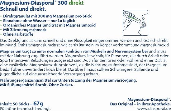 Magnesiummangel, wenn er ursache für störungen der muskeltätigkeit. Zur verfügung gestellt von gebrauchs.info. Ideal für den täglichen magnesiumbedarf. Ideal für aktive und für unterwegs. Другие товары, представленные вашему вниманию. Uztura bagātinātāji » vitamīni » magnijs » magnijs. Magnesium diasporal 300 direkt mutē šķīstošas granulas, 20 paciņas. Magnesium diasporal 300 direkt (magnijs) ar citronu garšu, 20 paciņas. Das direktgranulat kann schnell und ohne flüssigkeit eingenommen werden und löst sich direkt im mund. Магний добавки protina pharmazeutische gmbh magnesium diasporal 300 direkt granulat 50 stk (0wb076e00b) производитель: